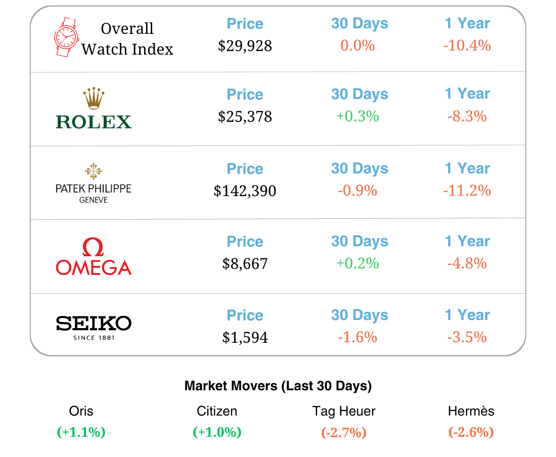 The numbers above represent market trends in secondhand watch prices. The “Price“ column represents the average secondhand price for the top 30 watches of each brand. This data is sourced from Watch Charts.