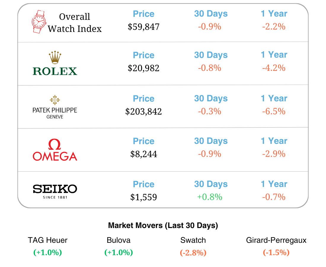 The numbers above represent market trends in secondhand watch prices. The “Price“ column represents the average secondhand price for the top 30 watches of each brand. This data is sourced from Watch Charts.